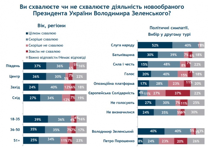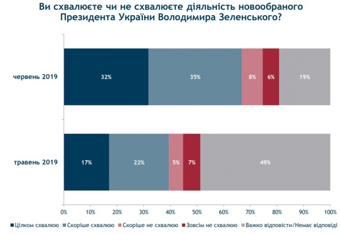 В мае, вернее по результатам работы Зеленского в течение 11 дней после инаугурации 20 мая, "вполне одобряли" его действия 17% опрошенных, "скорее одобряли" 22%.