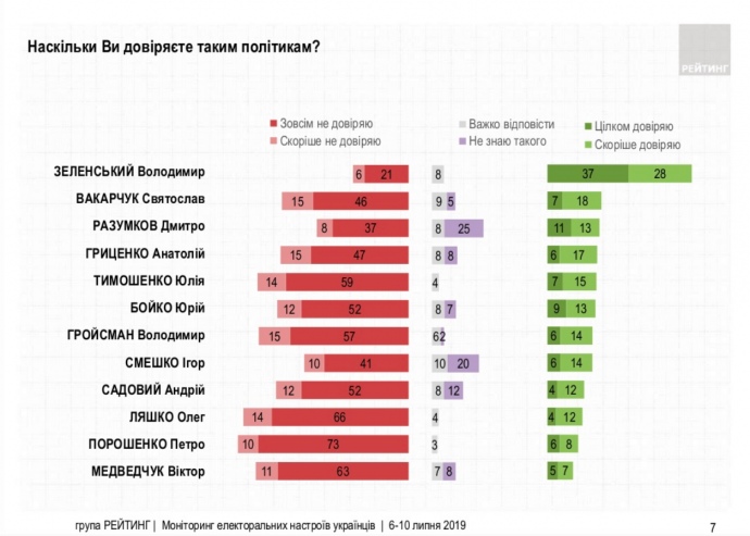 Следующий за главой государства – лидер партии "Голос" Святослав Вакарчук с уровнем доверия в 25%, при этом 18% скорее доверяют певцу, а 7% – полностью.