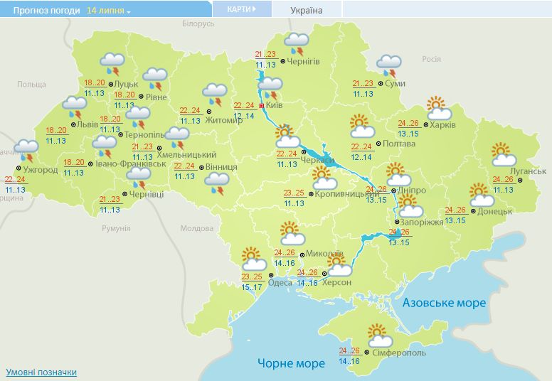 13 июля кардинальных изменений синоптической ситуации и погоды в Украине не ожидается, сохранится прохладная погода, да и 14 июля на западе и севере ожидаются дожди.
