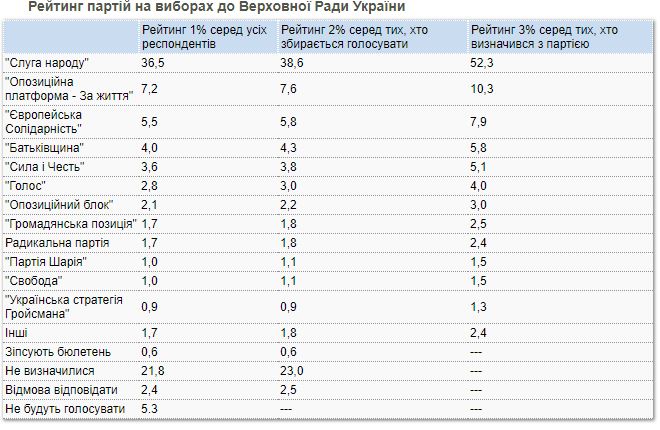 - Ранее Киевский международный институт социологии обнародовал результаты опроса, проведенного с 25 июня по 7 июля: "Слуга народа" - 48,5%, "Оппозиционная платформа - За Жизнь" - 14,1%, "Европейская Солидарность" - 9,2%, "Батькивщина" - 6,2%, "Голос" - 4,4%.