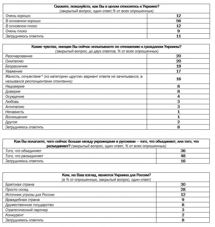 20% россиян испытывают к гражданам Украины симпатию, 17% – уважение.