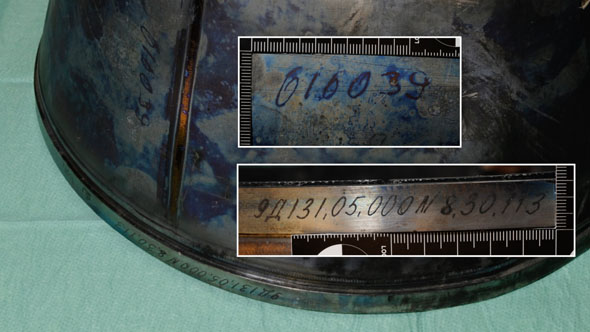 На корпусе двигателя нанесено номер 9д1318869032. По этому номеру установлено, что ракету выработали на Долгопрудненском научно-производственном предприятии в Подмосковье в 1986 году. Последние цифры на корпусе - 9032 - это уникальный идентификационный номер двигателя ракеты.