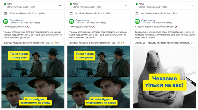 Официальная страница "Слуги народа" мобилизует своих сторонников принять участие в голосовании. Содержательно большинство сообщений идентично, однако таргетированы они на разные города.