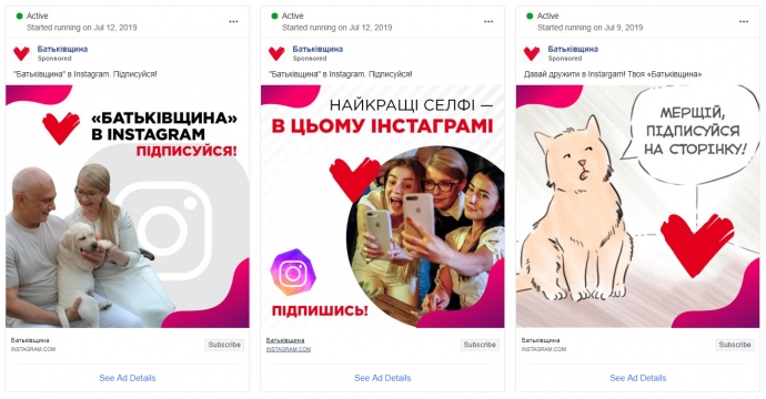 Партия "Батькивщина" продолжает продвигать свою страницу в Instagram, таким образом рекламируя и бренд партии, и ее лидера.