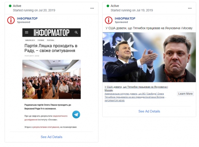 Ведут агитацию и контрагитацию и страницы, которые позиционируют себя как СМИ. Так, страница сайта "Информатор" одновременно рекламирует сообщение за "Радикальную партию" и другое сообщение против лидера ВО "Свобода" Олега Тягнибока.