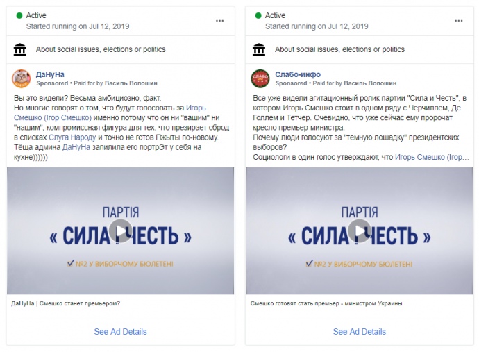 По состоянию на 12:00 21 июля на странице "Слуги народа" транслируется 34 активные рекламные сообщения.