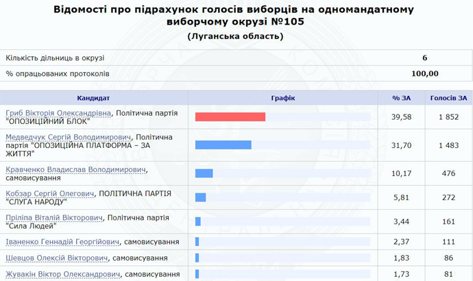 По результатам обработки 100% протоколов, брат Медведчука занимает вторую позицию (31,7%) и уступает место в Раде представительнице "Оппозиционного блока" Виктории Гриб (39,58%).