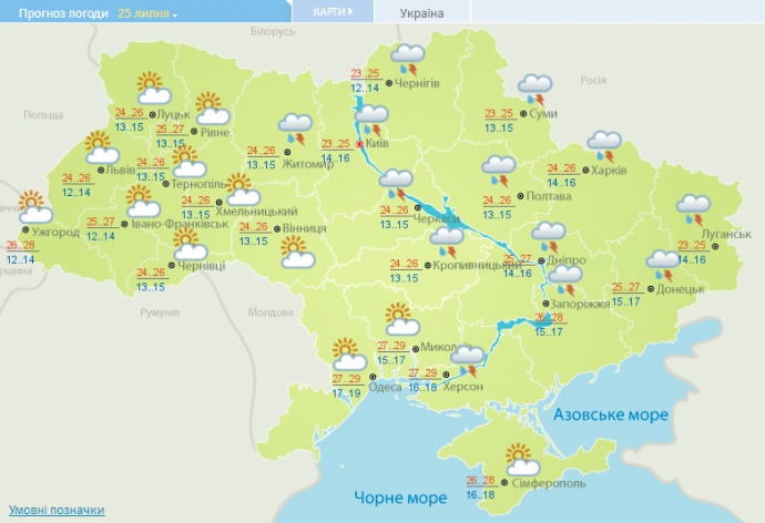 Отмечается, что 25 июля ожидается переменная облачность. Ночью в восточных и Сумской областях, днем в Украине, кроме западных, Винницкой, Одесской и Николаевской областей, кратковременные дожди, местами грозы. Ветер северо-западный, 5-10 м/с.