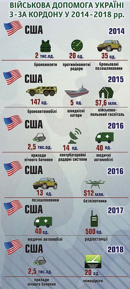 Среди стран, которые предоставили военную помощь Украине в 2014-2018 годах, также Канада, Великобритания, Франция, Германия, Дания и Словакия.