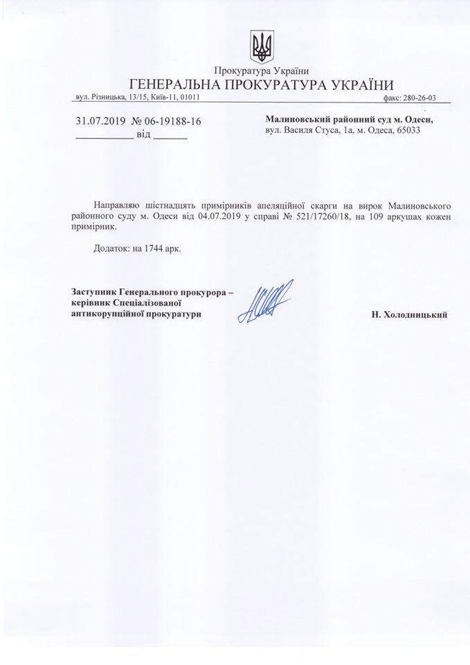 Руководитель Специализированной антикоррупционной прокуратуры Назар Холодницкий подал апелляцию на приговор Одесскому городскому голове Геннадию Труханову и других фигурантов дела одесского "Краяна".