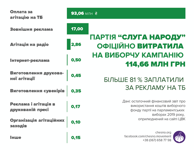 Общественное движение "Чесно" указывает, что большинство из этой суммы – свыше 93 миллиона – направили на агитацию на телевидении.