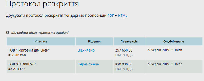 При этом отмечается, что Укрзализныця отклонила предложение конкурента - ООО "Торговый Дом Эней" (которое было) втрое дешевле, потому что последний не заверил скан-копию устава в составе предложения и не предоставил документы о предыдущем опыте выполнения контрактов.