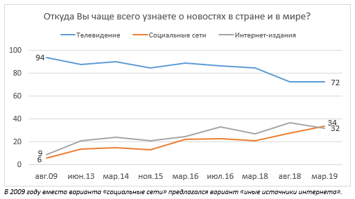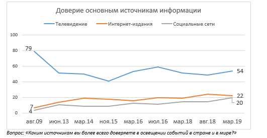 Доверие в России к телевидению, как источнику новостей, в последние несколько лет колеблется вокруг 55% населения. Однако десять лет назад эта цифра была на треть выше — почти 80% населения. Доверие к телевидению сохраняют прежде всего люди старше 35 лет.