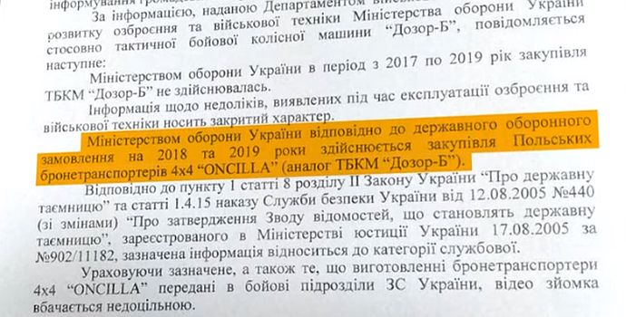 "Министерством обороны Украины, в соответствии с государственным оборонным заказом на 2018 и 2019 годы, осуществляется закупка польских бронетранспортеров 4х4 Oncilla (аналог ТКБМ "Дозор-Б")", – ответил Департамент военно-технической политики, развития вооружения и военной техники Минобороны.