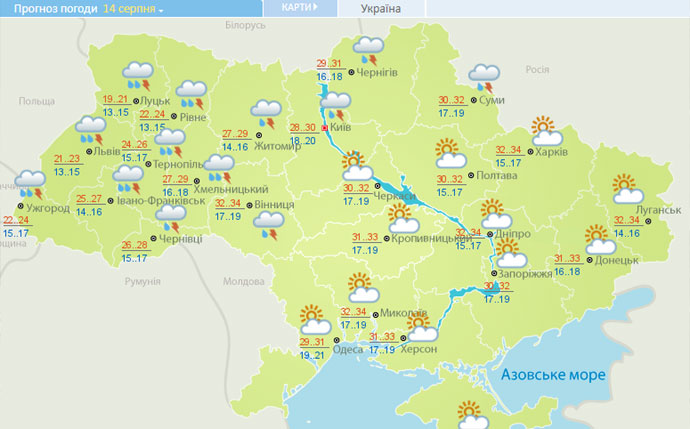 Прямая речь: "Сильная жара еще подержится за южную часть, восток и большинство центра, +30+35 градусов. На западе ощутимо похолодает, в течение дня предполагается +19+24 градуса, однако в Тернопольской, Хмельницкой и в Черновицкой областях будет выше, +26+29 градусов... Ослабнет жара в северных областях Украины – там ожидается +28+32 градуса".