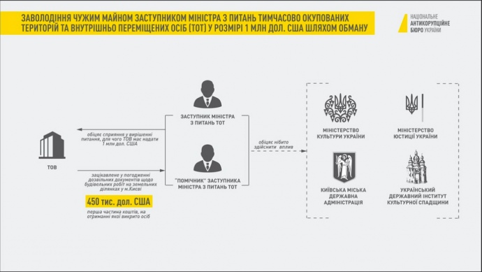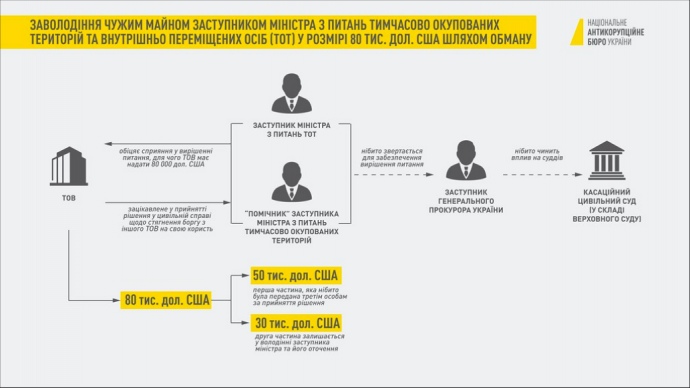 - 14 августа заместителя министра по вопросам временно оккупированных территорий и внутренне перемещенных лиц Грымчака и его помощника задержали при получении 480 тысяч долларов взятки.