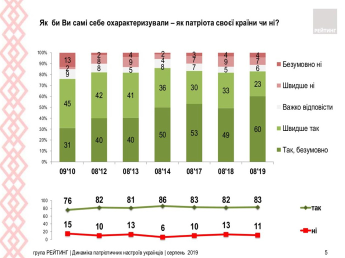 Дословно: "Патриотами своей страны считают себя 83% граждан Украины (почти столько же как и в 2018 году). Только 11% имеют противоположное мнение, еще 6% затруднились ответить.