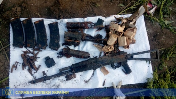 Дословно: "Тайник был размещен в одном из поселков Новоайдарского района. Сотрудники СБУ изъяли автомат Калашникова АК-74, два подствольных гранатомета, 3 гранаты Ф-1, 7 гранат РГД-5, 40 выстрелов к ВОГ-25, 1220 патронов калибра 5.45 мм, глушитель к автомату Калашникова. Арсенал направлен на экспертизу".