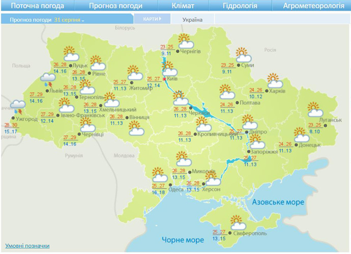 До 1 сентября в Украине продержится сухая малооблачная воздушная масса, средняя температура воздуха днем не опустится ниже 23-24 градусов тепла.
