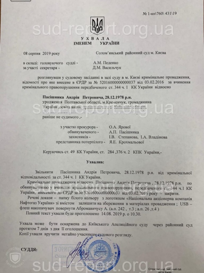 8 августа 2019 года, по словам Пасишника, суд это дело закрыл и снял с него обвинения. Пасишник говорит, что в суде представитель потерпевшего и прокурор САП Ольга Яровая против ходатайства о прекращении производства не возражали.