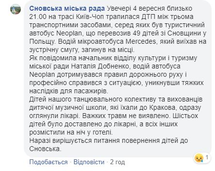 Сновский городской совет в комментарии к посту в Facebook: "Детей нашего танцевального коллектива и воспитанников детской музыкальной школы, которые ехали в Краков, сразу осмотрели врачи. Тяжелых травм не обнаружено.