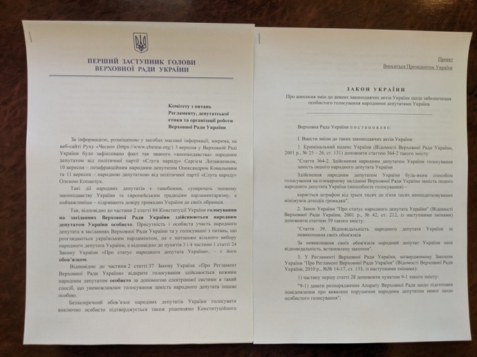 Дословно из проекта закона "О внесении изменений в некоторые законодательные акты Украины относительно обеспечения личного голосования народными депутатами Украины".
