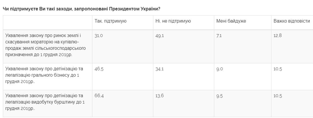 Принятие закона о рынке земли и отмене моратория на куплю-продажу земли сельскохозяйственного назначения до 1 декабря 2019 года поддерживает 31% опрошенных, а не поддерживает 49,1%.