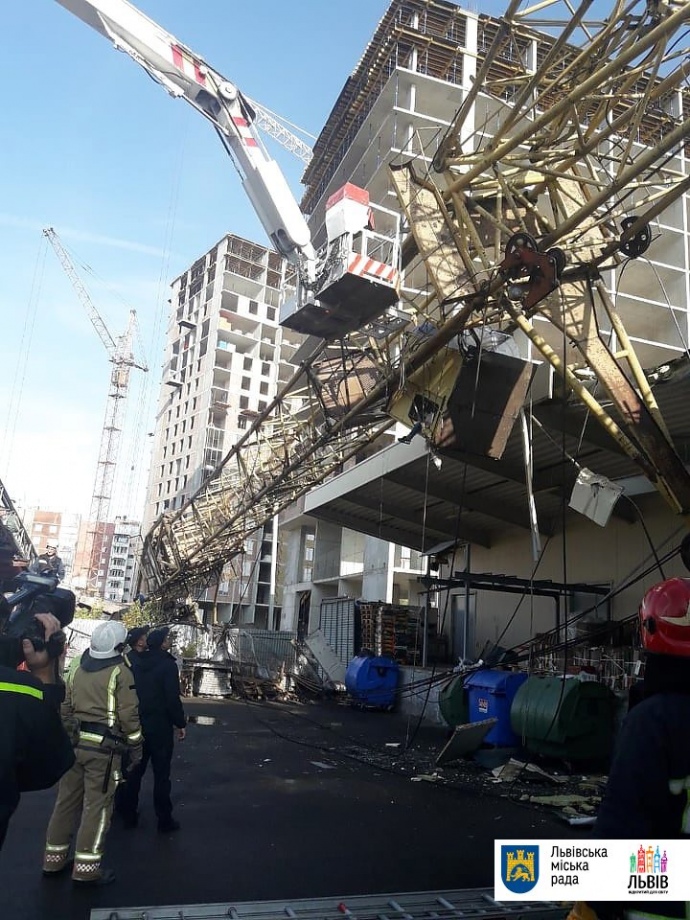 Строительный кран упал на ТЦ во Львове: пострадал человек