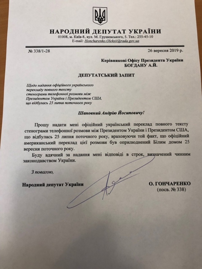 Народный депутат от фракции "Европейская солидарность" Алексей Гончаренко просит Офис президента опубликовать свою версию стенограммы июльского телефонного разговора Владимира Зеленского с президентом США Дональдом Трампом.
