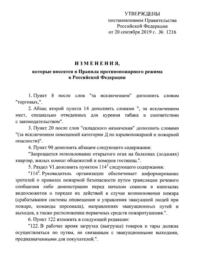 Правилами также установлены новые требования к обеспечению пожарной безопасности медицинских учреждений и кинотеатров. Так, кинотеатры обязали перед сеансами информировать зрителей о действиях в случае пожара. Что касается больниц, то теперь палаты для детей и тяжелобольных будут размещаться преимущественно на первых этажах.