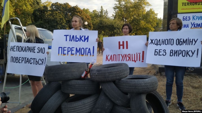 Также участники акции отмечают, что все трое подозреваемых являются гражданами Украины, поэтому их выдача России, по их мнению, противоречит украинскому законодательству, а сам факт обмена обвиняемых в теракте свидетельствует о "безнаказанности совершения терактов на территории Украины".
