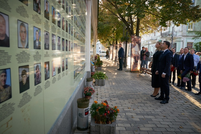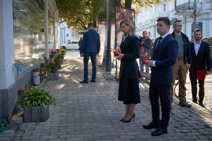 Утром в понедельник глава государства и первая леди Елена Зеленская пришли к Стене памяти погибших за единство Украины возле Михайловского Златоверхого монастыря в Киеве, где почтили память погибших военнослужащих и правоохранителей.