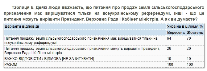 По сравнению с сентябрьским опросом на 6 процентных пунктов (с 64% до 70%) выросла доля тех, кто считает, что вопрос о продаже земли сельскохозяйственного назначения должен решаться только на всеукраинском референдуме.