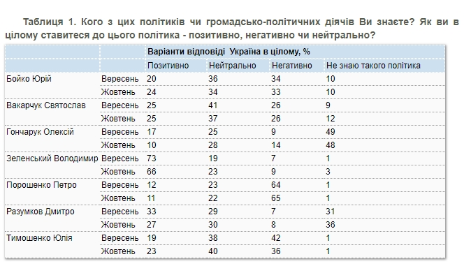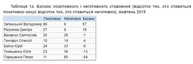 По балансу положительного и отрицательного отношения в октябре 2019 года на первом месте Зеленский (баланс + 57%), Разумков (19) и Вакарчук (-1%), далее следуют Гончарук (-4%), Бойко (-9%), Тимошенко (-13%), Порошенко (-54%).