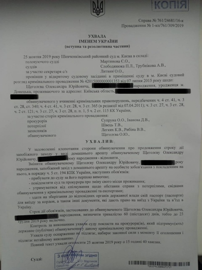 Детали: Прокуроры, которые ходатайствовали о продлении круглосуточного домашнего ареста для Щеголева, говорили наличии рисков, что подозреваемый может скрываться от суда или давить на свидетелей.