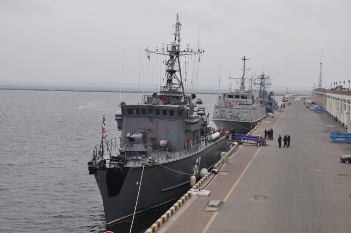 Дословно: "К причалу Одесского морского вокзала пришвартовались минные тральщики четырех стран альянса: испанский ESPS "Sella", румынский "Ros Lupu Dinescu", болгарский BGS "Shkval" и итальянский ITS "Numana".