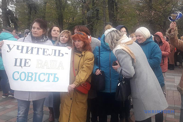 Около тысячи педагогов из разных регионов собрались на акцию протеста в Киеве против изменений, которые народные депутаты предложили в закон о среднем образовании.