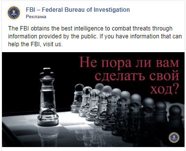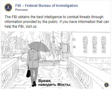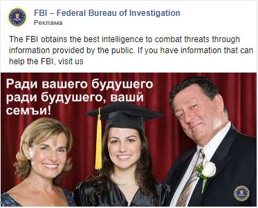 Федеральное бюро расследований (ФБР) запустило в социальной сети Facebook рекламу с картинками на русском языке, с призывом делиться со спецслужбой информацией о возможных угрозах безопасности.