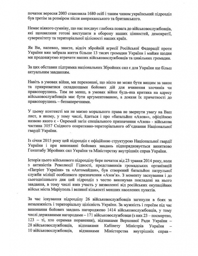 Дословно: "Попытки назвать Азов "террористической организацией" или "насильственной иностранной группировкой белых супрематистов" болью отзываются в сердцах украинских военных и добровольцев, которые защищают страну от оккупантов...