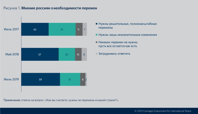 С лета 2017 года количество россиян, выступающих за "решительные и полномасштабные изменения" в России увеличилась с 42 до 59%.