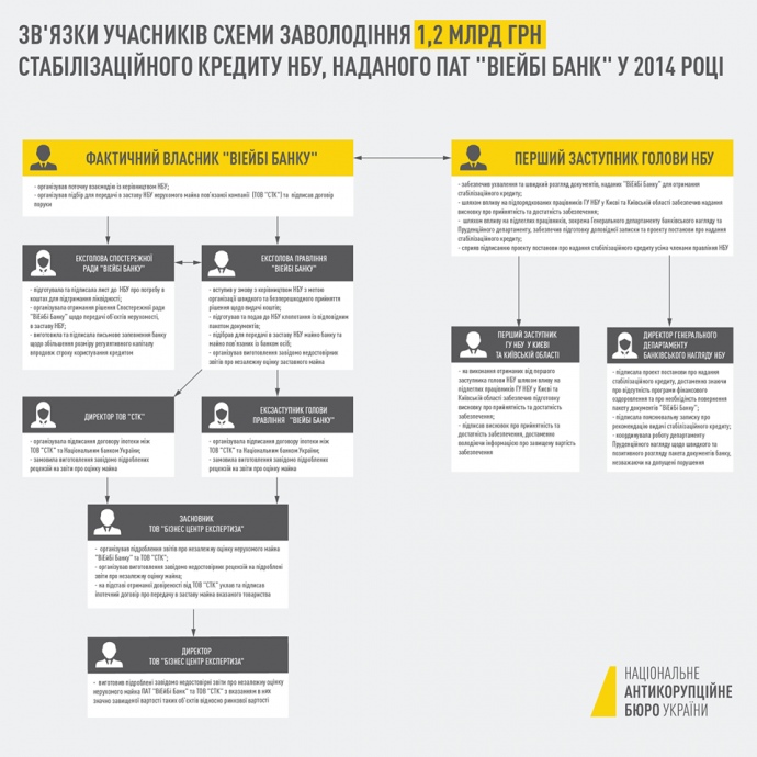 Что было раньше: 11-12 ноября детективы Национального бюро под процессуальным руководством прокуроров САП сообщили 8 лицам о подозрении в завладении 1,2 млрд грн стабилизационного кредита, предоставленного Национальным банком Украины ПАО "ВиЭйБи Банк".