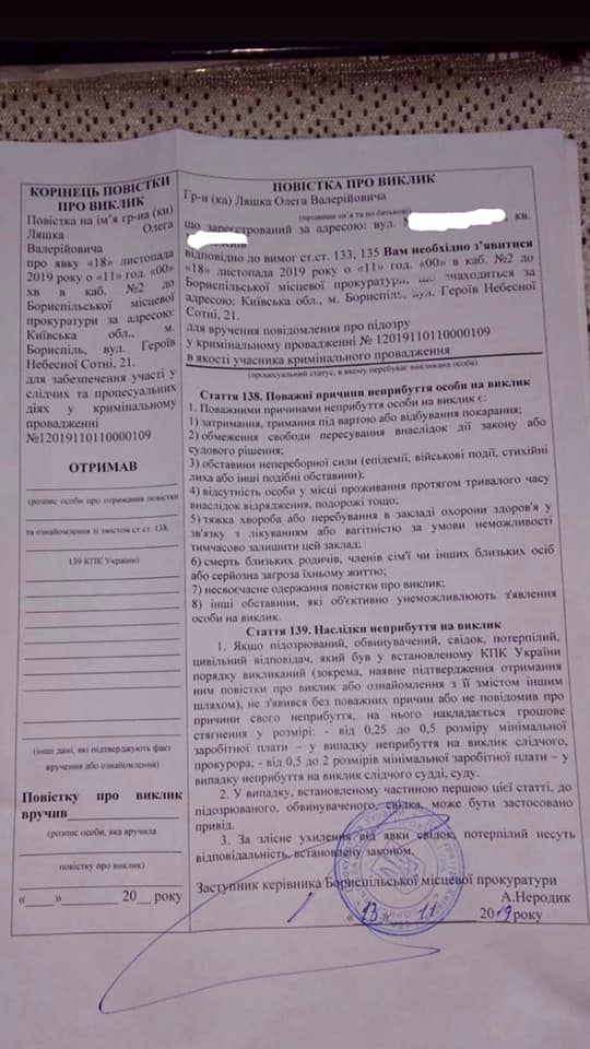 Прямая речь: "Сегодня получил сообщение из Бориспольской прокуратуры. Меня вызывают на 18 ноября для вручения подозрения по делу Геруса".