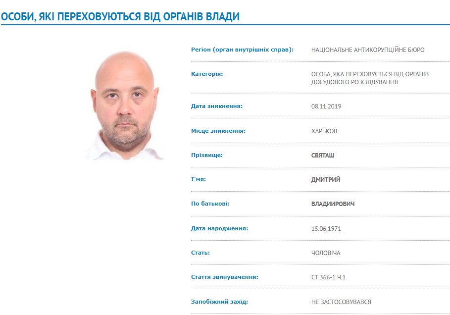 Детали: Информация о розыске Святаша по делу, подследственному НАБУ, размещена в разделе "Лица, скрывающихся от органов власти" с пометкой о дате его исчезновения 8 ноября 2019 г.