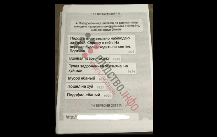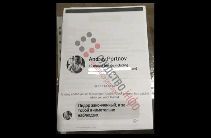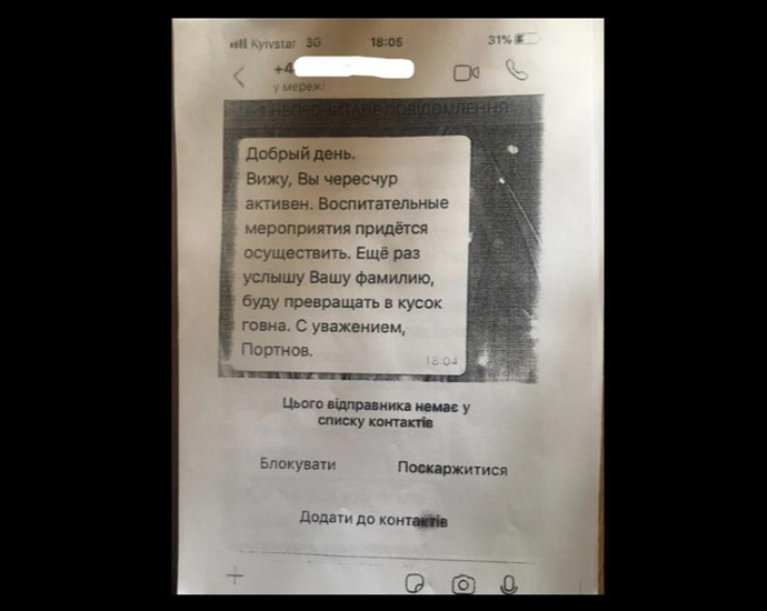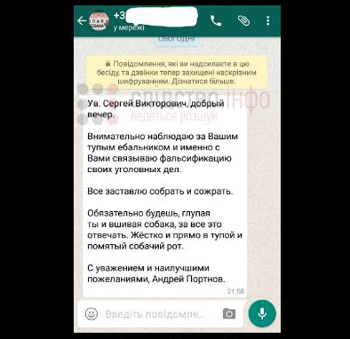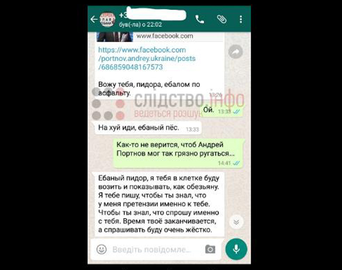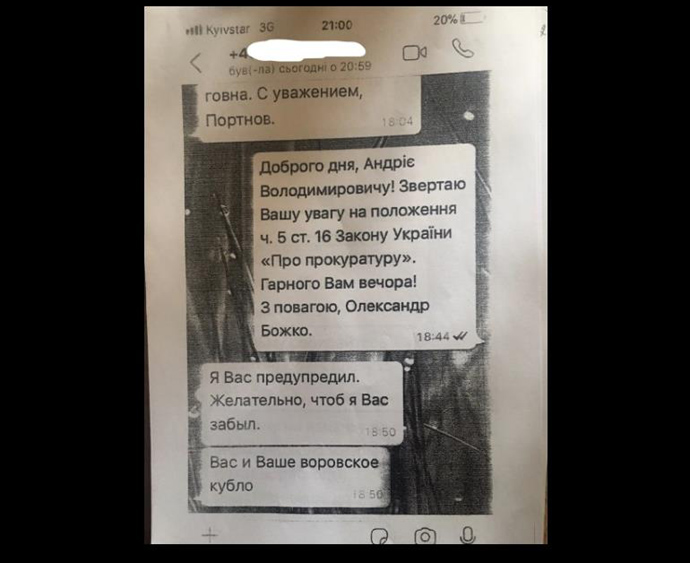 Божко рассказал, что сразу после того, как он пытался связаться со свидетелем в этом производстве, на его телефон пришло сообщение: "Здравствуйте. Вижу, вы слишком активен. Воспитательные меры придется принять. Еще раз услышу ваше имя, буду превращать в кусок дерьма. С уважением, Портнов".