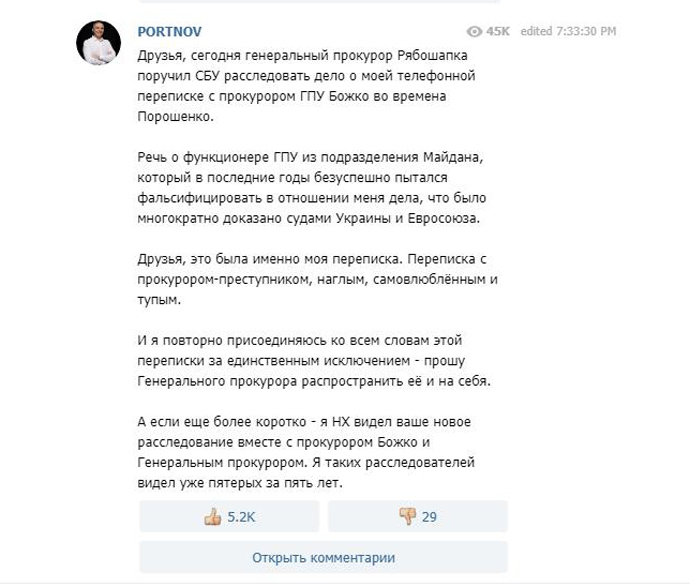 В Telegram-канале Портнов подтвердил, что писал Божко: "Друзья, это была именно моя переписка. Переписка с прокурором-преступником, наглым, самовлюбленным и тупым. И я повторно присоединяюсь ко всем словам этой переписки с единственным исключением - прошу генерального прокурора распространить ее и на себя".