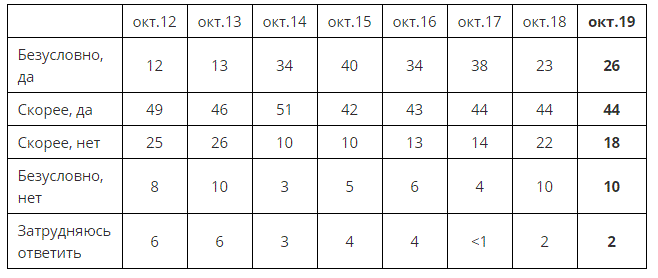 При этом одобряют деятельность Путина, по состоянию на октябрь 2019 года, в целом 70% - безусловно поддерживают 26% и скорее поддерживают 44%. Эти показатели у Путина были максимальными в 2014 году – 34% и 51%