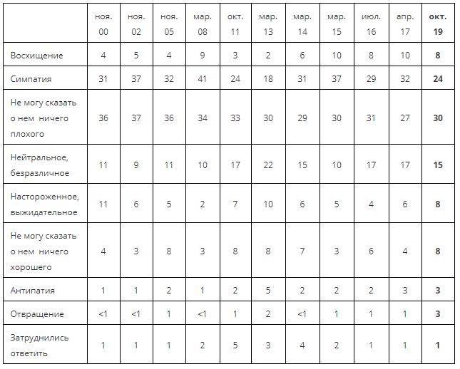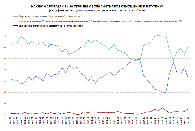 С 2017 года в целом позитивное (симпатия и восхищение) отношение к Путину снизилось на 10 процентных пунктов, а нейтрально-дистанцированное — выросло на 7% до 61%.