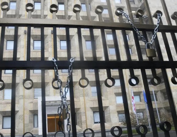 Протестующие символически повесили замок на заборе у здания администрации правительства Грузии в Тбилиси. Сначала они пытались запереть главный подъезд, но полиция не допустила их к месту.