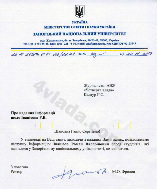 Запорожский национальный университет ответил: "Иванисов Роман Валерьевич среди студентов, которые учились в Запорожском национальном университете не значится".