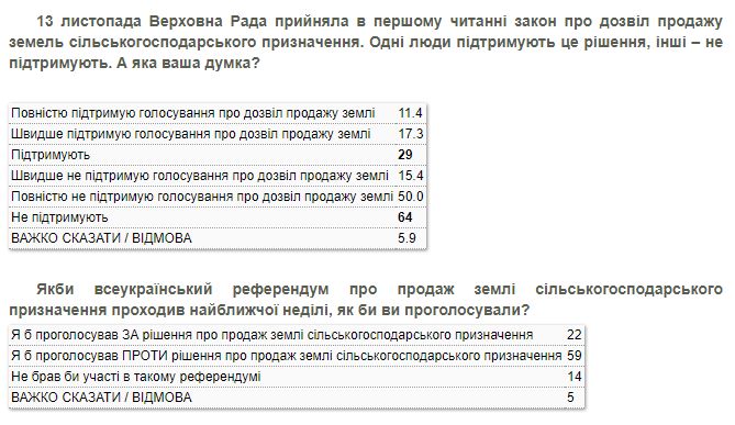 Если бы всеукраинский референдум о продаже земли сельскохозяйственного назначения проходил в ближайшее воскресенье, 22% украинцев проголосовали бы на референдуме "за" рынок земли, 59% – "против", еще 14% не участвовали бы в голосовании.